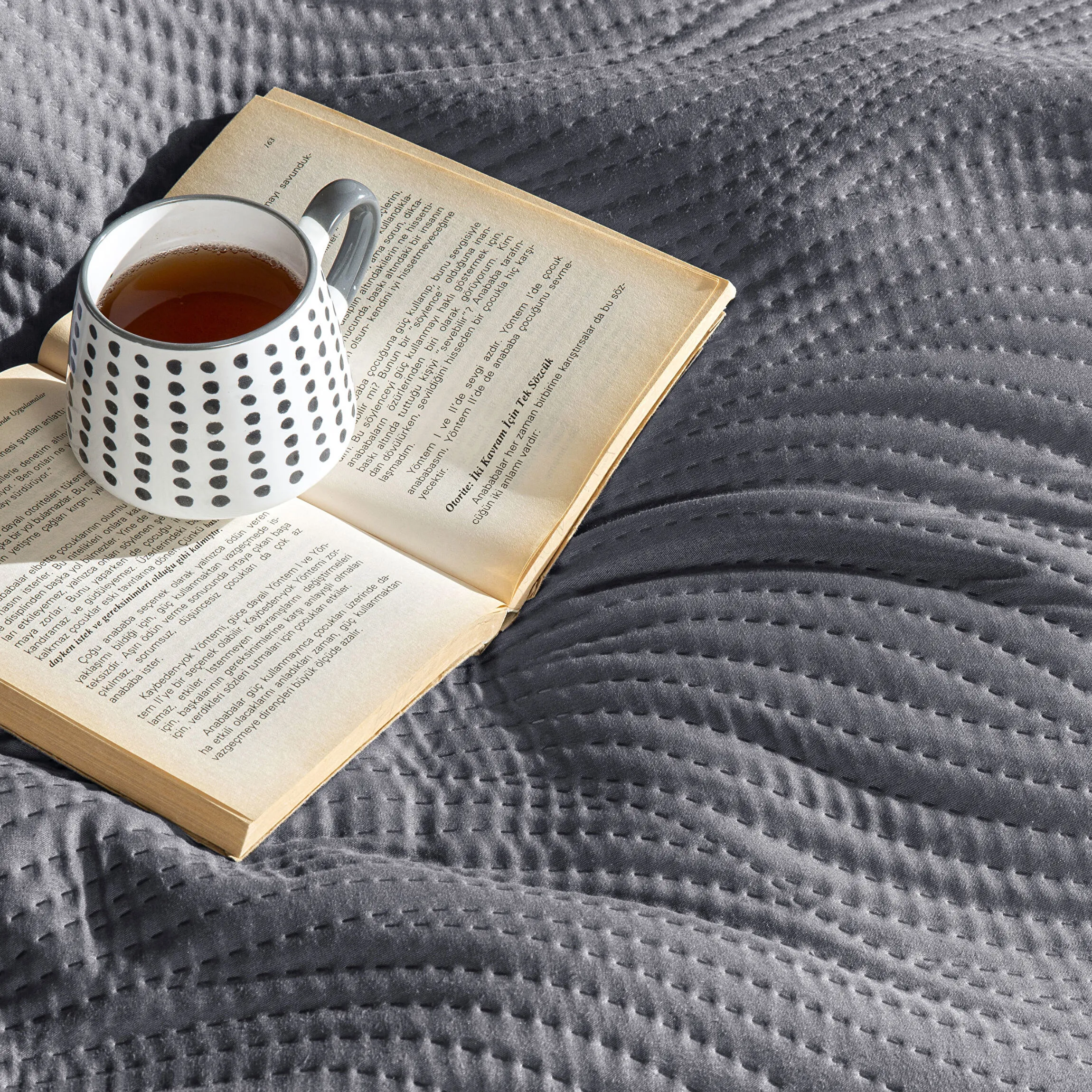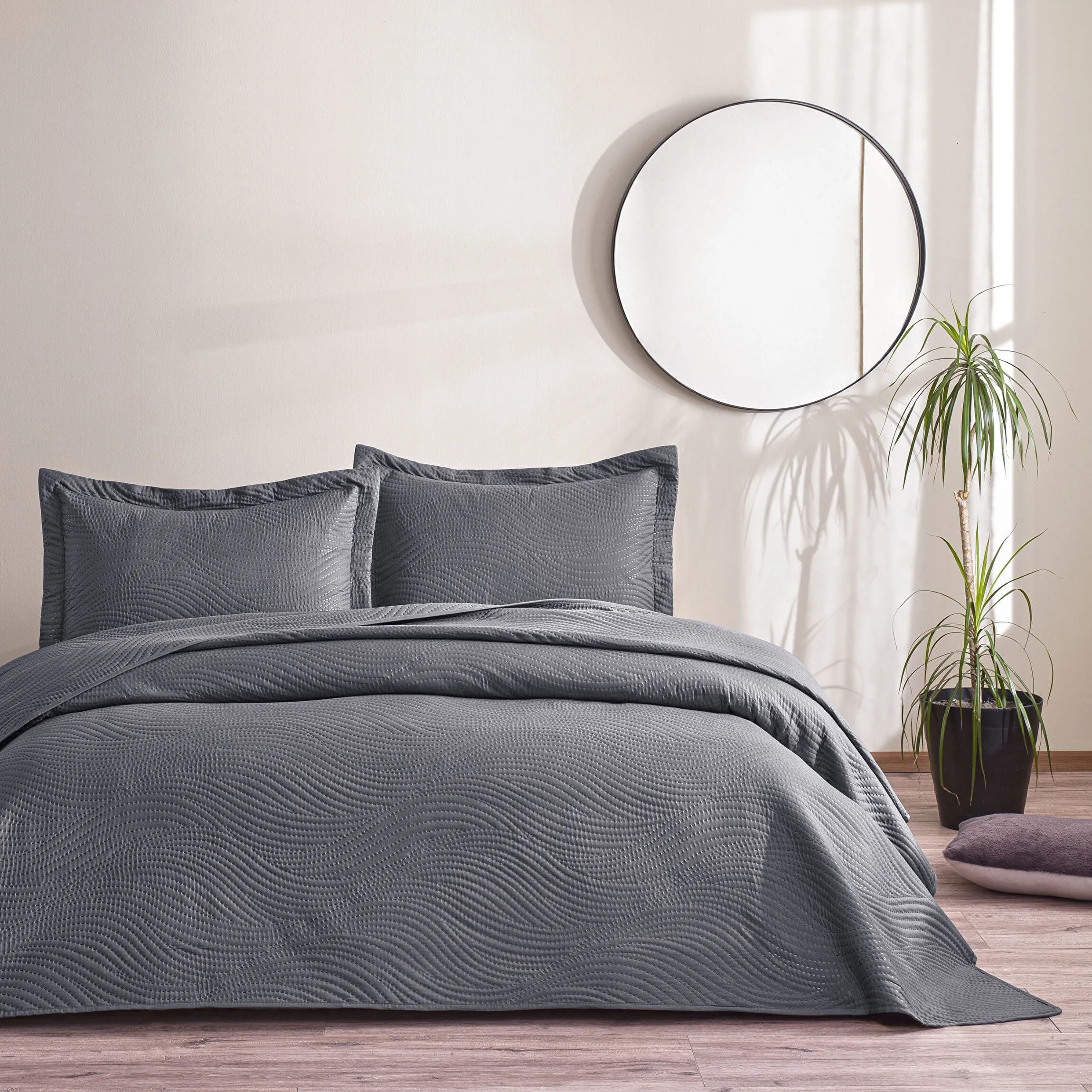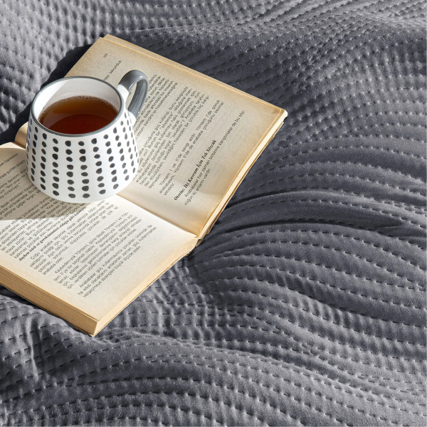 Cuvertura pat matlasata TAC DELUXE pentru 2 persoane Harlo antracit,250 x 260 cm perfecta pentru a adauga confort si stil camerei tale. Cuvertura este disponibila intr-o varietate de culori vibrante care se pot potrivi perfect stilului oricarui dormitor. Ea poate fi usor curatata si are dimensiuni generoase pentru a se potrivi cu usurinta pe perna sau pat. Cuvertura este realizata din materiale de cea mai buna calitate si este foarte moale si placuta la atingere. Doua fete de perna sunt incluse in pachetul cuverturii, astfel incat sa te bucuri de un somn odihnitor si relaxant.