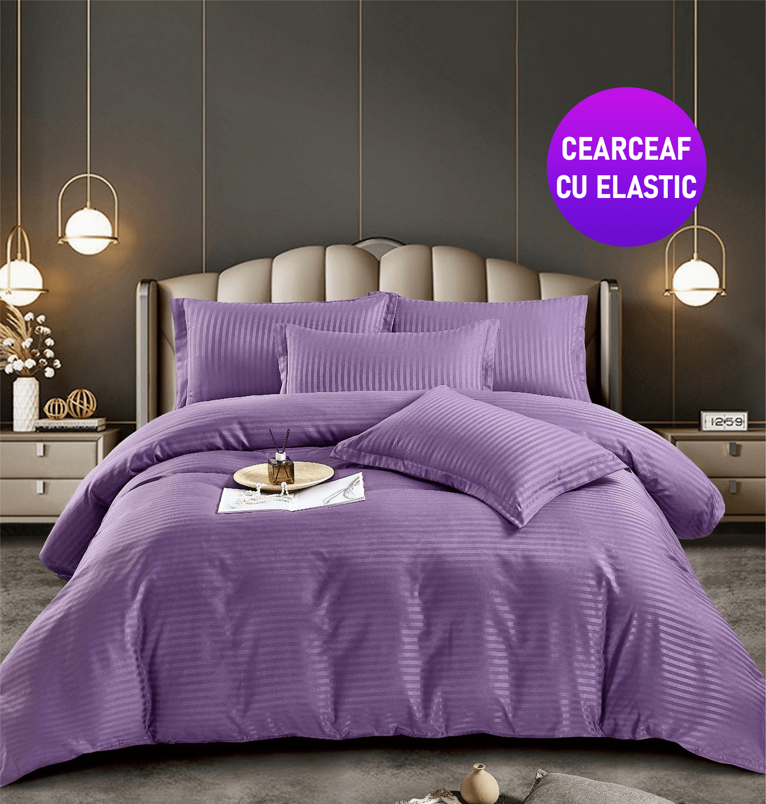 Caracteristici Lenjerie cu elastic Damasc Finet 6 piese Mov