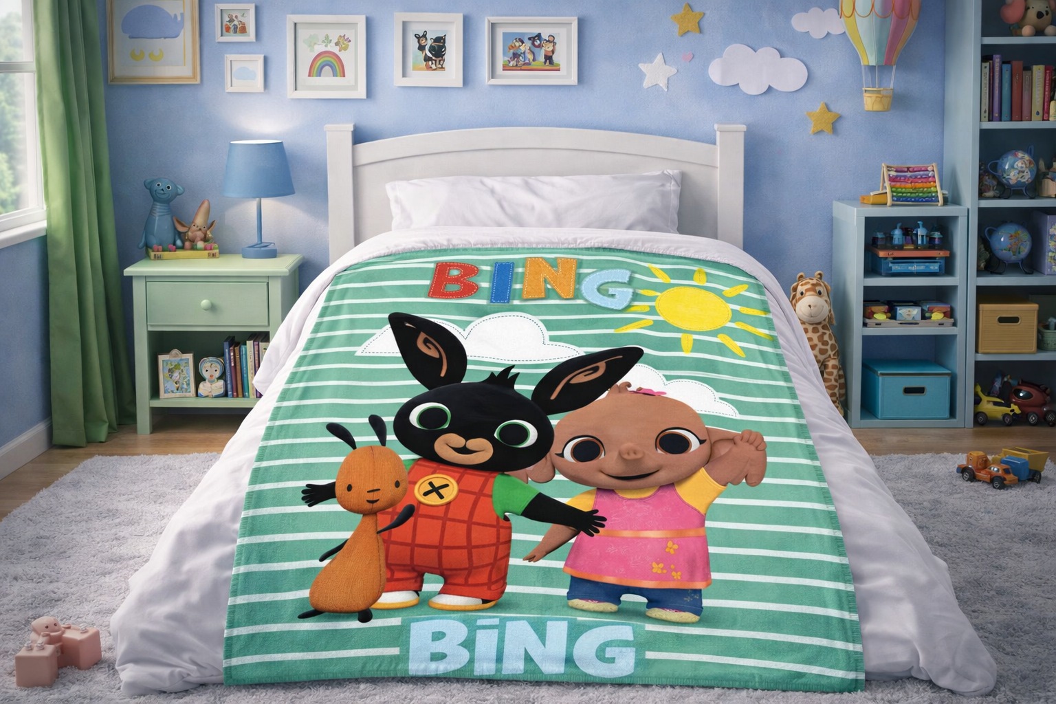 Transformă fiecare moment de relaxare într-o aventură magică cu pătura pentru copii Bing Sun, alegerea perfectă pentru micii fani ai universului plin de culoare și imaginație. Cu un design vesel, în nuanțe multicolor, această pătură aduce personajele preferate direct în camera copilului.