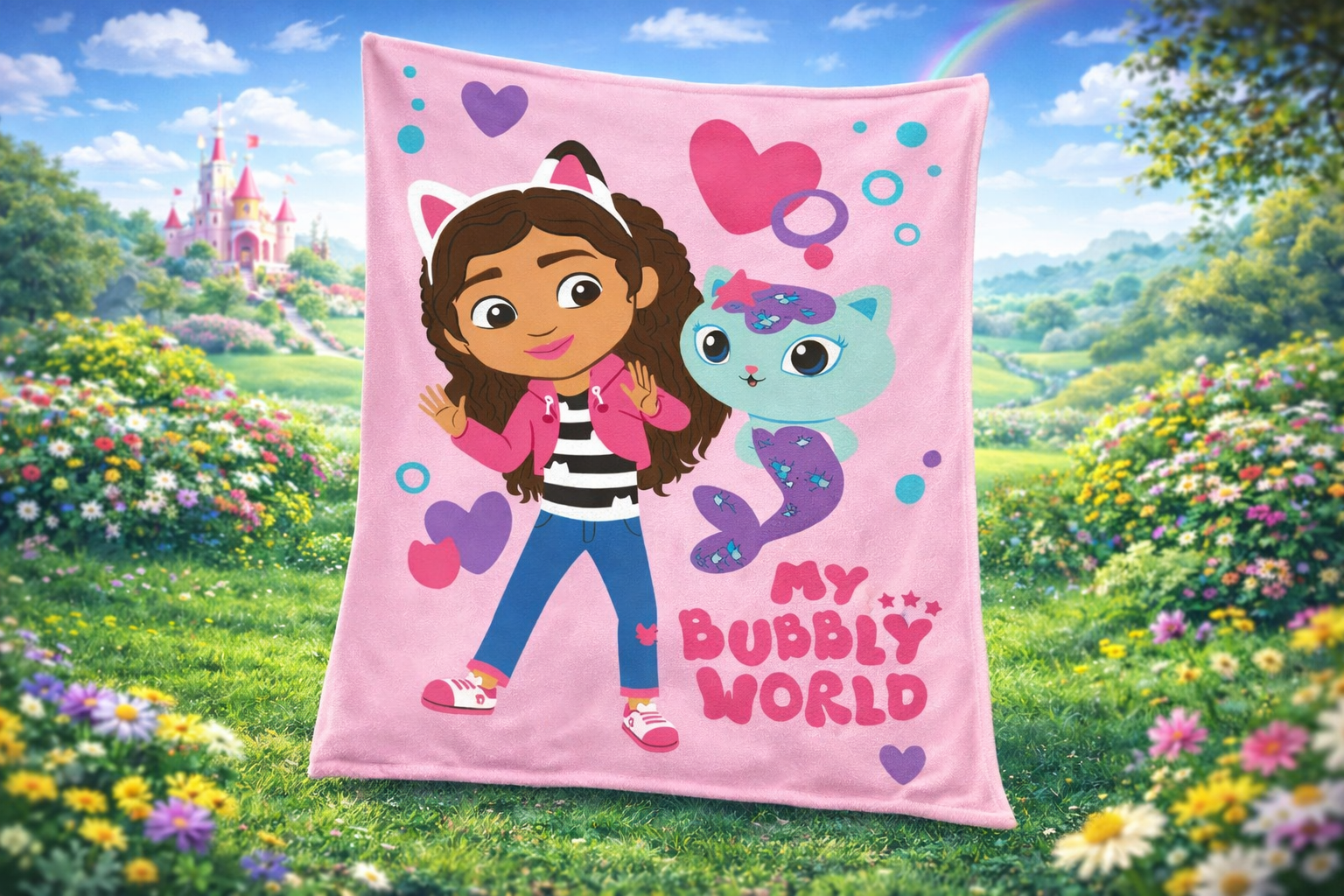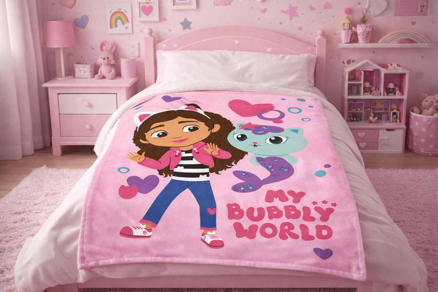 Pătură pentru copii Gabby’s Dollhouse „Bubbly World” 100×150 cm – pătură fleece moale, roz, pentru fete