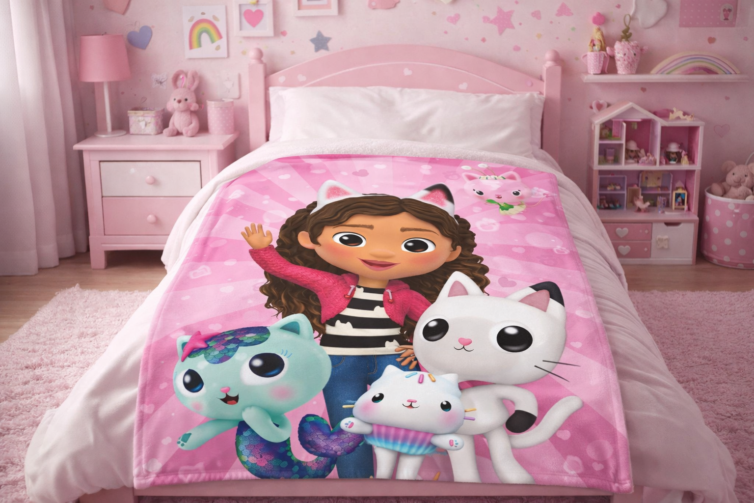 Transformă fiecare moment de relaxare într-o aventură magică cu pătura pentru copii Gabby’s Dollhouse „Happiness”, alegerea perfectă pentru micii fani ai universului plin de culoare și imaginație. Cu un design vesel, în nuanțe de roz și multicolor, această pătură aduce personajele preferate direct în camera copilului.