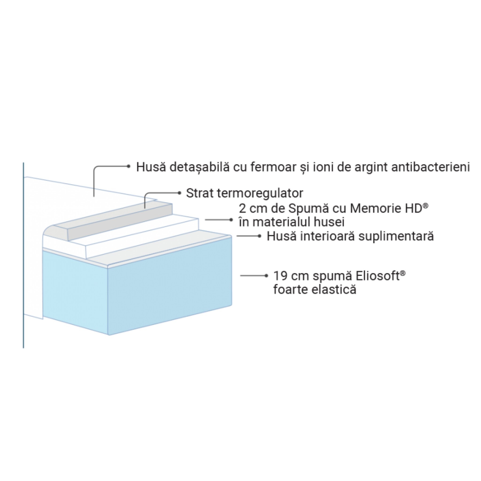 - Material inovator: Stratul de spumă cu memorie se adaptează la forma corpului, distribuind uniform greutatea și reducând punctele de presiune.