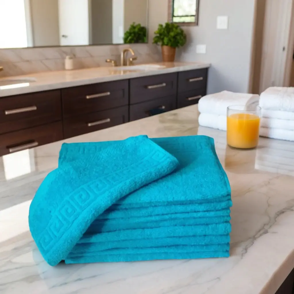 Set 10 Prosoape Bumbac Pieptănat, 30×50 cm, 500 gr/mp, Greek Border – Turcoaz. Acest set de prosoape premium din bumbac pakistanez oferă o experiență de lux, similară celei dintr-un hotel de 5 stele. Fabricate din bumbac pieptănat 100%, cu fir dublu și cusături rezistente, prosoapele sunt extrem de moi, absorbante și durabile.