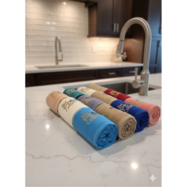 Set de 12 prosoape de bucătărie green dk, din bumbac 100%, foarte absorbante, cu broderie decorativă și agățătoare integrată. Dimensiune 30×50 cm, ideale pentru orice gospodărie.