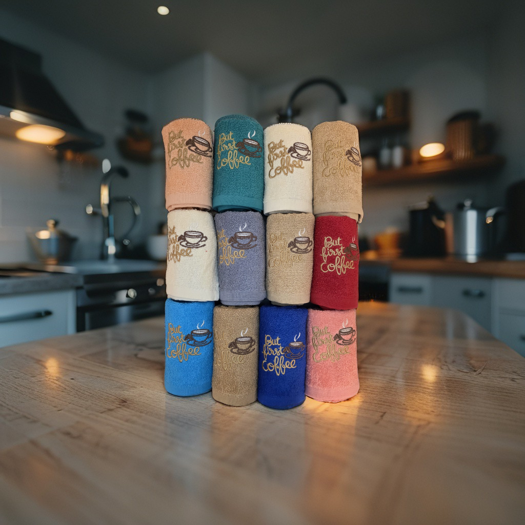 Set de 12 prosoape de bucătărie Coral, din bumbac 100%, foarte absorbante, cu broderie decorativă și agățătoare integrată. Dimensiune 30×50 cm, ideale pentru orice gospodărie.