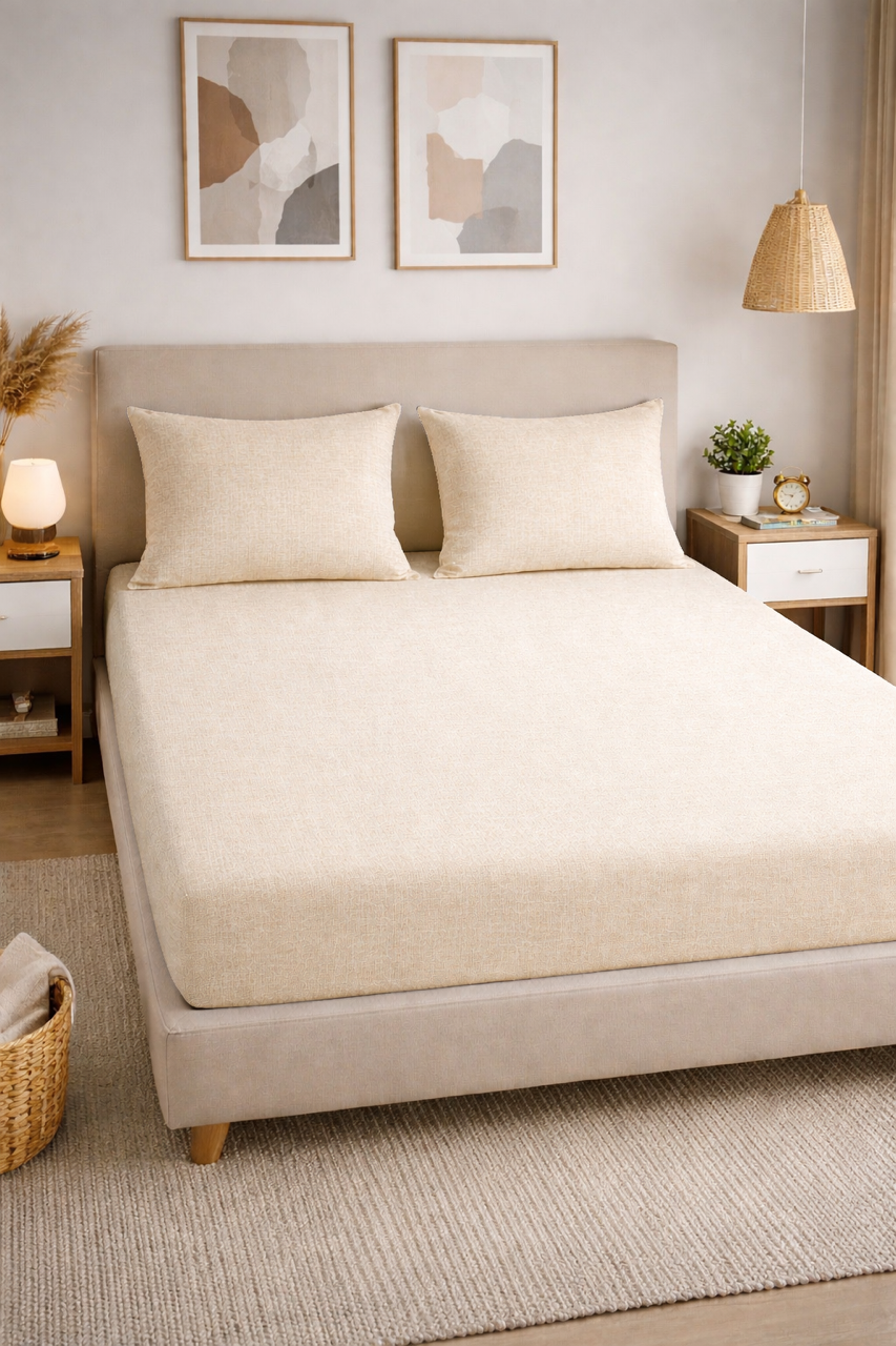 Set Cearceaf cu Elastic + 2 Fete de Pernă 50×70 cm, Bumbac Mercelizat, 160×200 / 180×200 cm-Crem